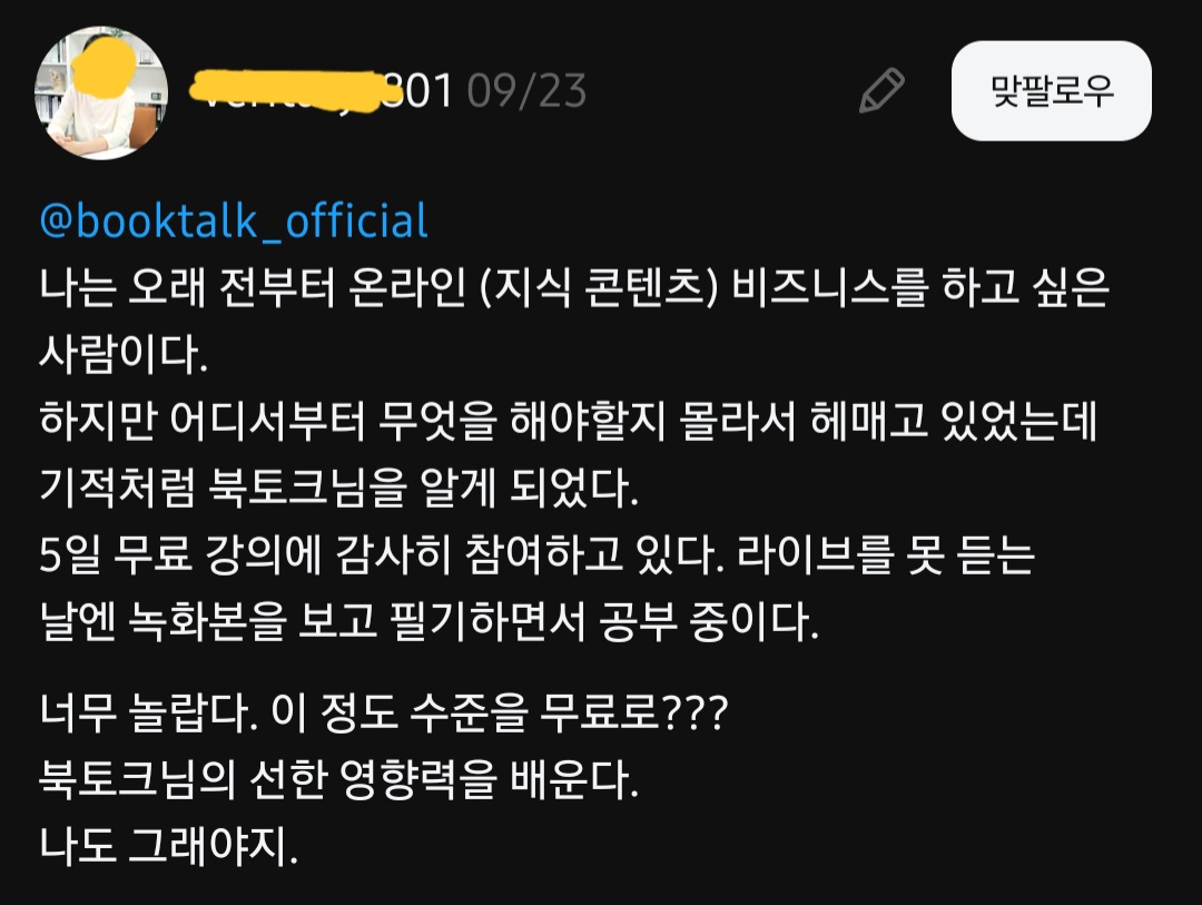 뉴스레터를 보낼 때마다 많은 분들이 '너무 유익하다.', '북토크 메일만 기다린다.' 많은 칭찬과 격려를 남겨주십니다.
