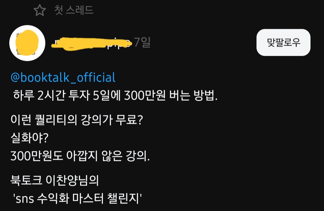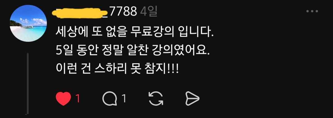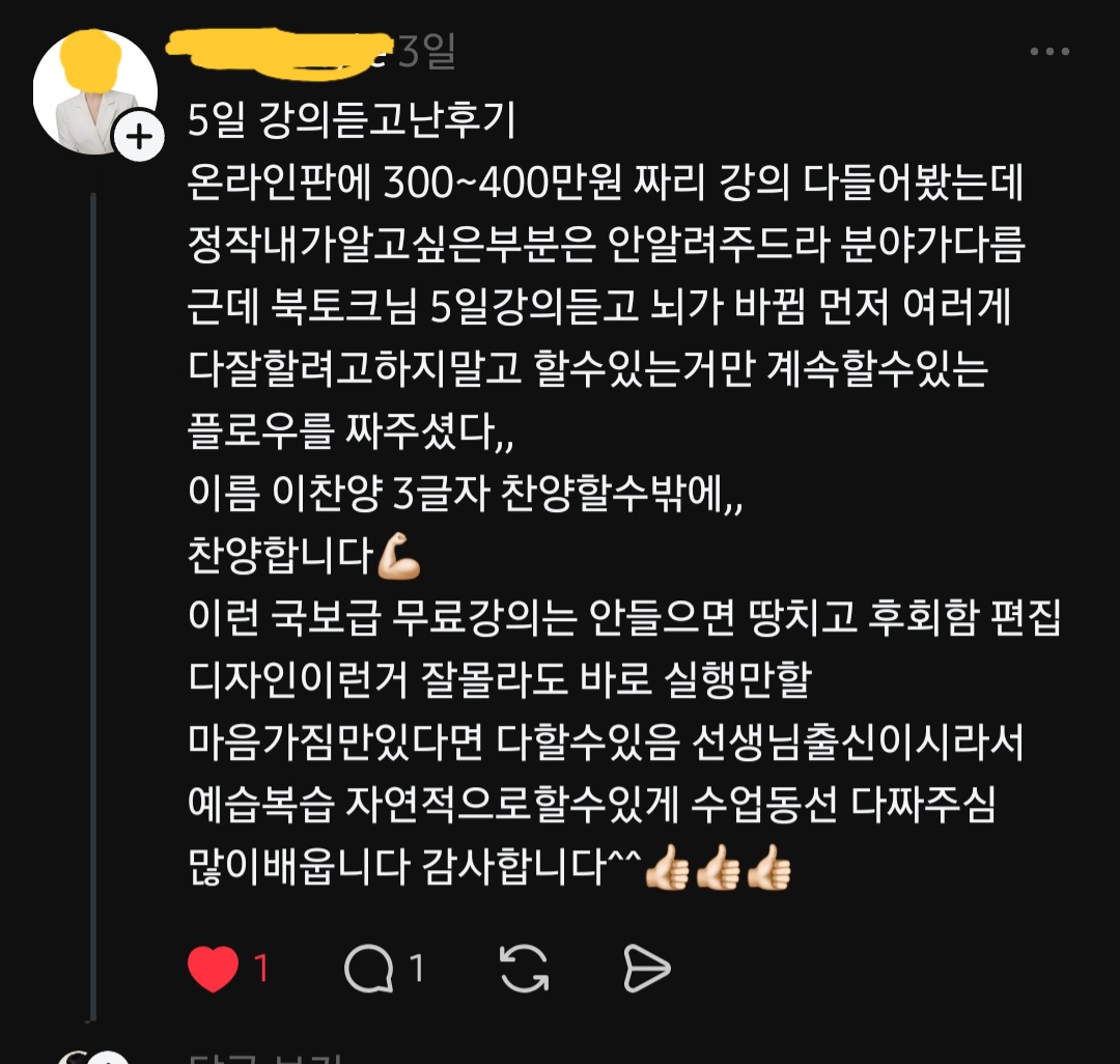그뿐만 아니라, 무료 강의만 듣고 SNS(스레드)를 시작해 하루 만에 팔로워 300명, 1주일 만에 팔로워 2,000명을 돌파하신 분도 계셨습니다 (이건 이 분 실천력이 어마어마한 덕이 더 큽니다.) |