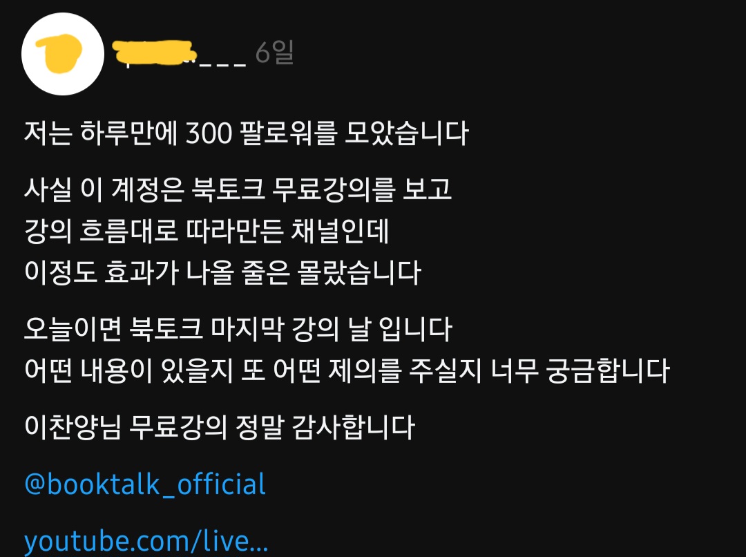 여러분이 계시기에 북토크 채널이 존재할 수 있고, 여러분이 계시기에 제가 성장하고, 그리고 우리 모두 함께 더 성장할 수 있었습니다.